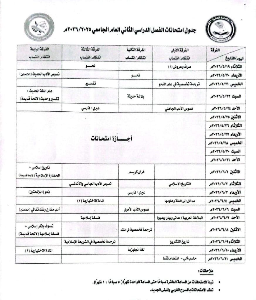 جدول امتحانات الفصل الدراسي الثاني العام الجامعي 2025-2026